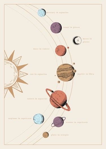 For this project, I had the chance to design and illustrate the template for a digital astrology report. Part of the design challenge was to visually distinguish between parts of the report that were standard, and parts that were personalised. I came up with the idea to have the personalised pages be an off-white colour, and the standard ones to be black so that there was a clear visual divide.